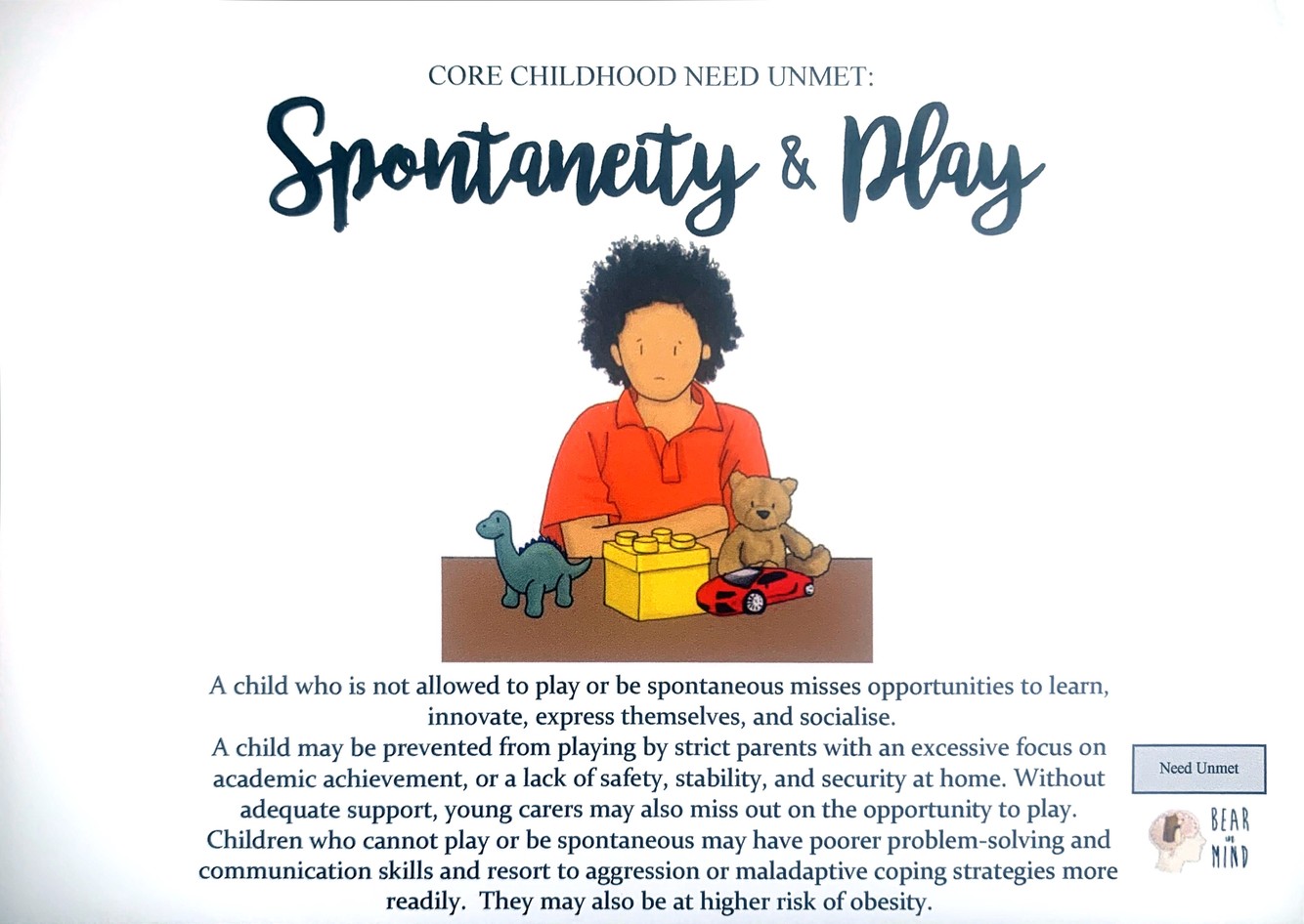 Children who cannot play or be spontaneous may have poorer problem-solving and communication skills and resort to aggression or maladaptive coping strategies more readily. They may also be at higher risk of obesity.