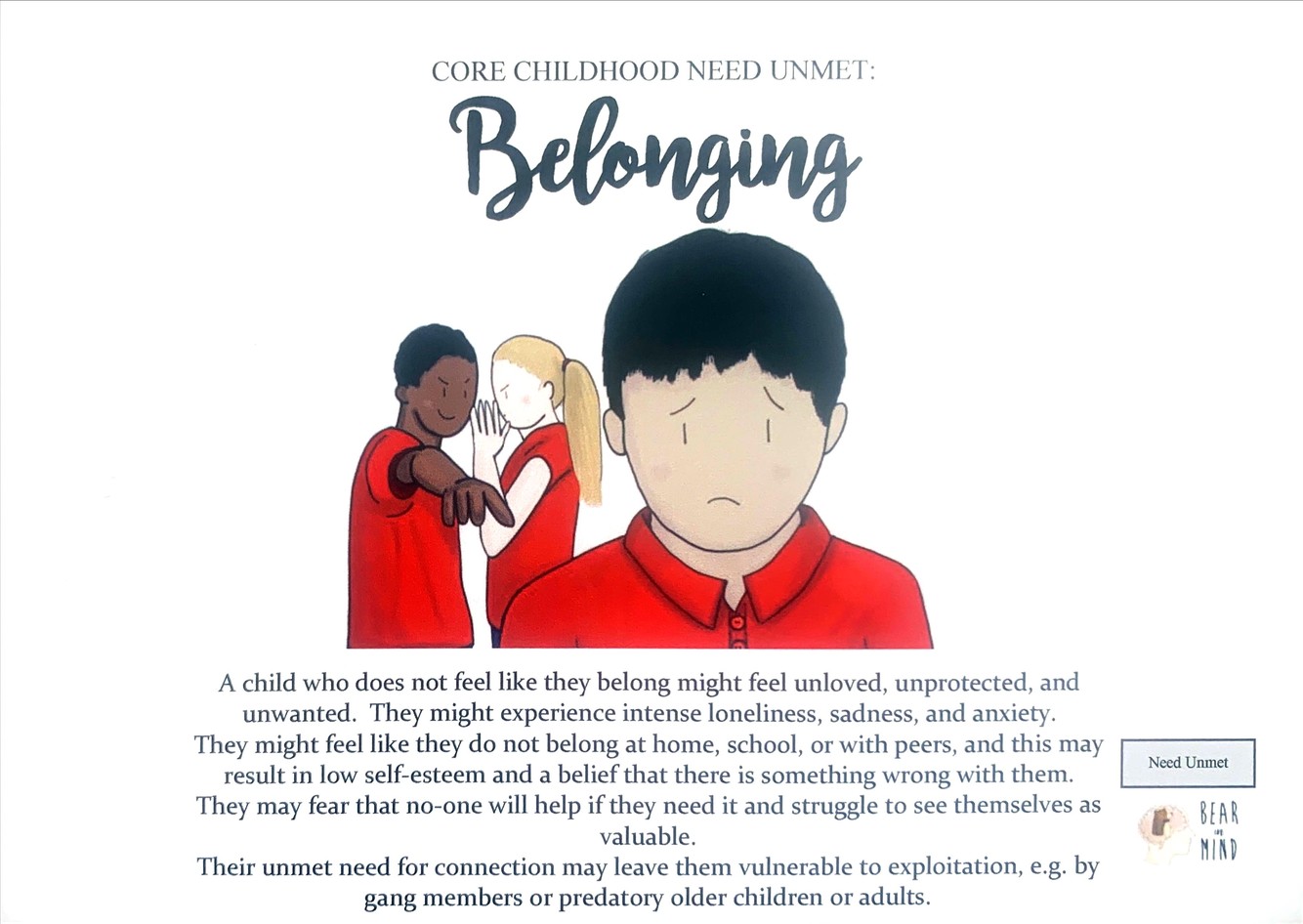 Their unmet need for connection may leave them vulnerable to exploitation, e.g. by gang members or predatory older children or adults