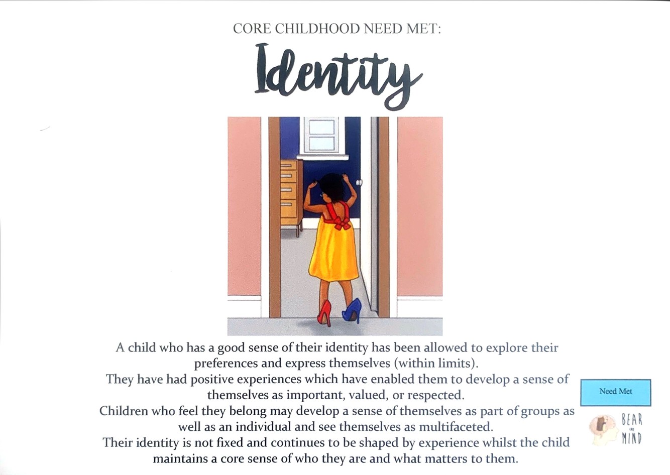 A child who lacks opportunities to be appreciated for their unique qualities or is told these are unacceptable, undesirable, or unwelcome will struggle to develop a positive sense of their own identity