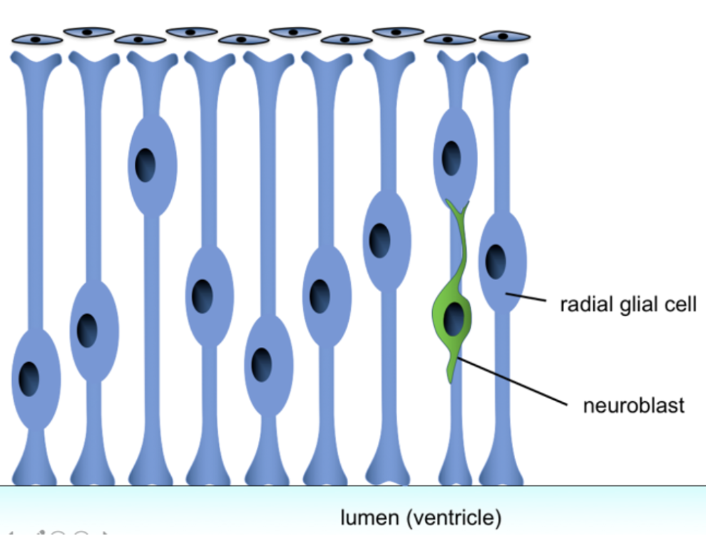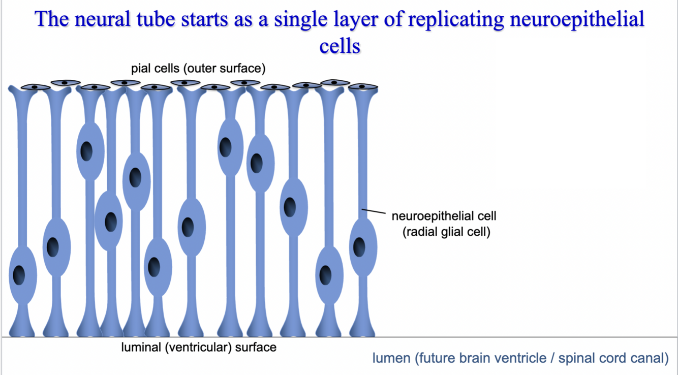 The neural tube begins as a single layer of radial glial cells. These migrate from pial–>luminal surface. They divide perpendicularly to increase neural tube SA til tube closes off
