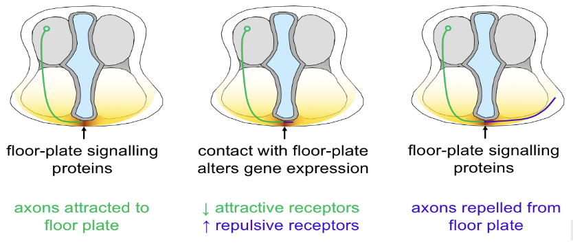 However, once the axon reaches the floor plate, downregulation of the attractive receptors + expression of the repulsive receptors causes the growth cone to grow laterally away from the floor plate