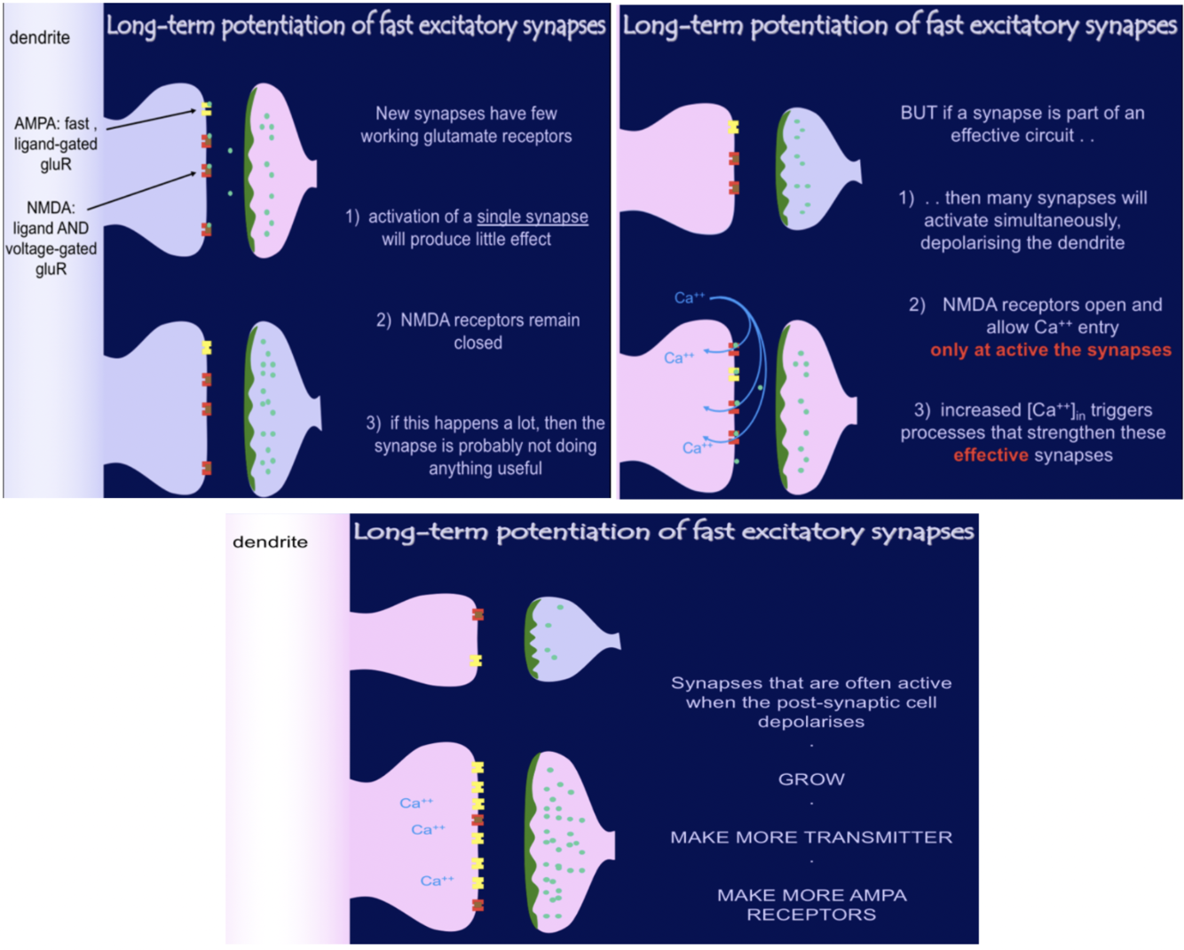 BUT activation of a single synapse=little effect as most receptors are NMDA, which don’t get activated by ligand-binding unless the membrane they’re in is strongly depolarised. If this happens a lot, synapse isn’t useful, so removed
