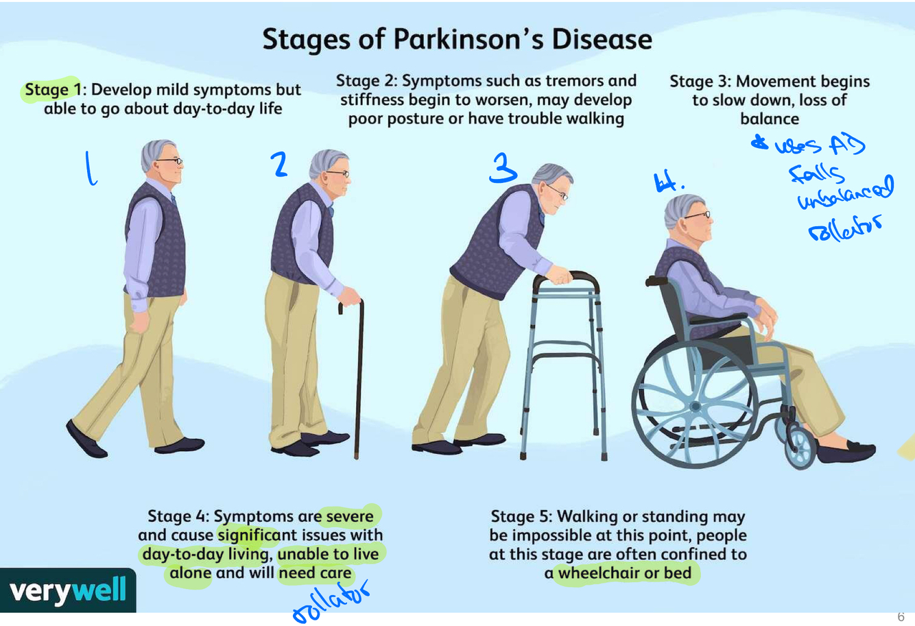 • Stage 5: Walking or standing may be IMPOSSIBLE @ this point, people in Stage 5 often confined to WC or bed (WORST)