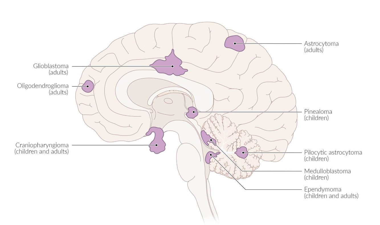 Typical locations of various brain tumors