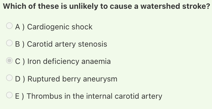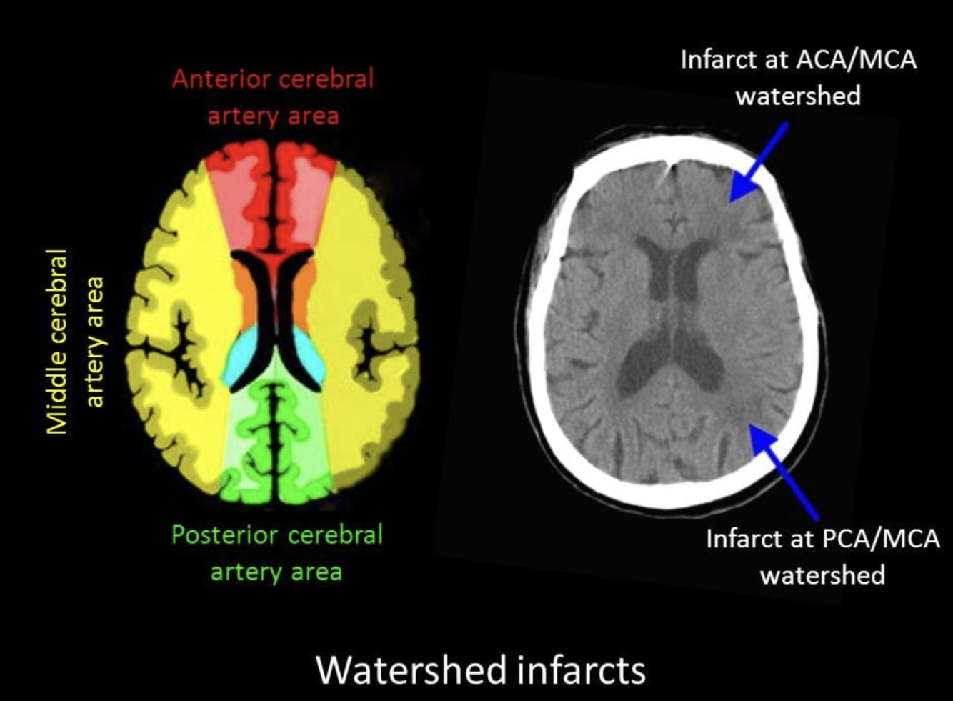 A watershed stroke is a form of ischaemic stroke. They tend to be caused by insufficient blood flow to the brain (e.g. carotid artery stenosis, arrhythmia or heart failure) or a vascular blockage/restriction far upstream of the infarct. This results in an infarct of the border zones between the tissues supplied by the ACA, MCA, and PCA.