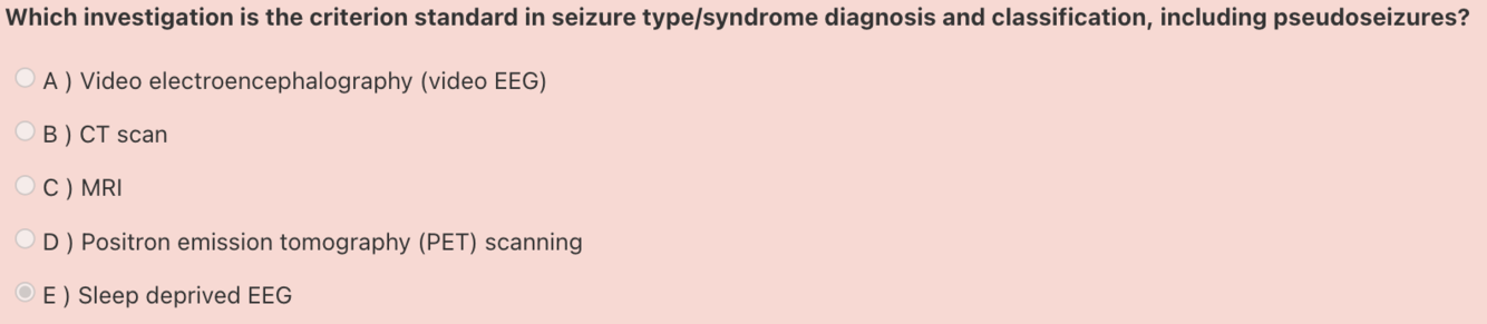 Video EEG monitoring is the criterion standard for classifying the type of seizure or syndrome or for diagnosing pseudoseizures. This study can be performed to rule out an epileptic etiology with a high degree of confidence if the patient has demonstrable impairment of consciousness during the spell in question, without abnormality on the EEG. Video EEG is also used to characterize the type of seizure and epileptic syndrome to optimize pharmacologic treatment and for presurgical workup.