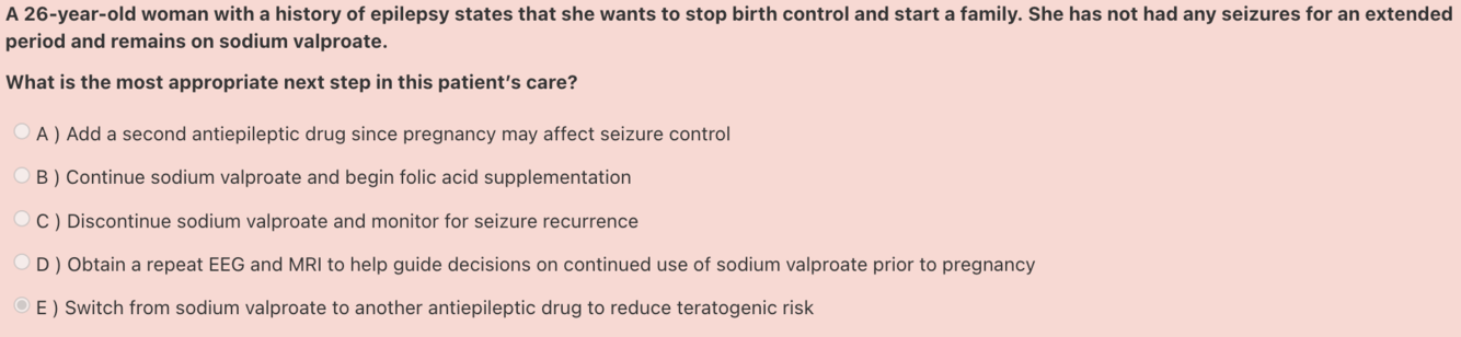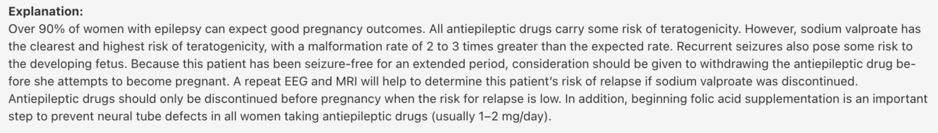 Answer: Obtain a repeat EEG and MRI to help guide decisions on continued use of sodium valproate prior to pregnancy
