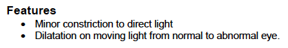 What are the features of RAPD/Marcus Gunn Pupil?
