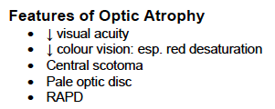 What are the features of Optic Atrophy?