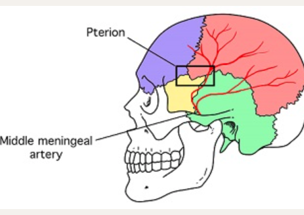 The pterion is made up of the frontal, temporal, sphenoid, parietal bones, it is where these bones meet. Clinical significance being: