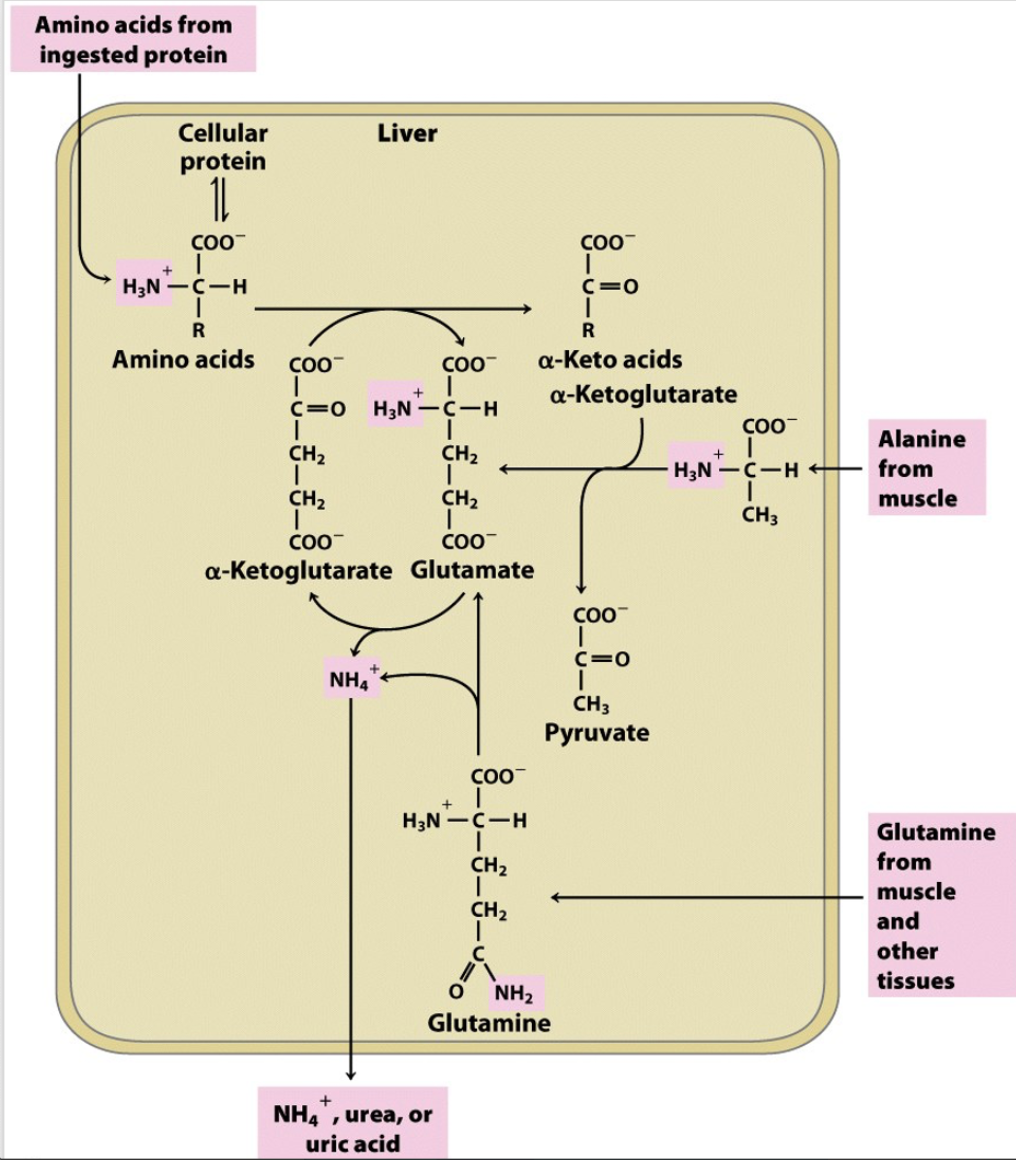 Recaptures the ammonia from glutamate and enters the urea cycle.