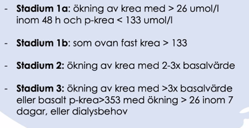 Stegrande kreatinin och minskad urinavgång (förutsätter att patienten är hydrerad)