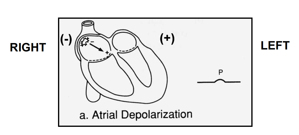 explain what occurs in atrial depolarization and what will appear on the ECG trace (6)