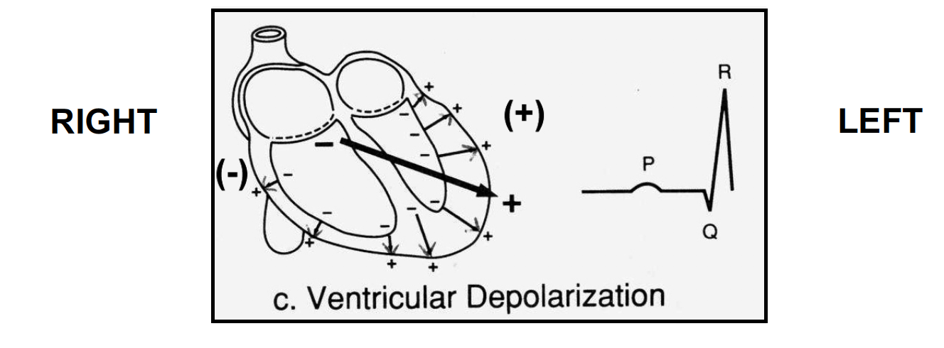 once its gone thru septum –> goes down bundle branches to the purkinje bundles –> the outside starts to depolarize –> dipole positive end is closer to the positive end –> trace end goes up –> very high because greater number of dipoles created compared to the atrium (R wave)