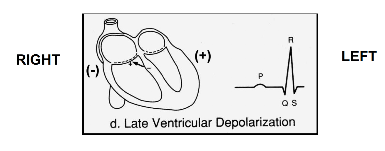 explain what occurs in late ventricular depolarization and what it appears like on the ECG