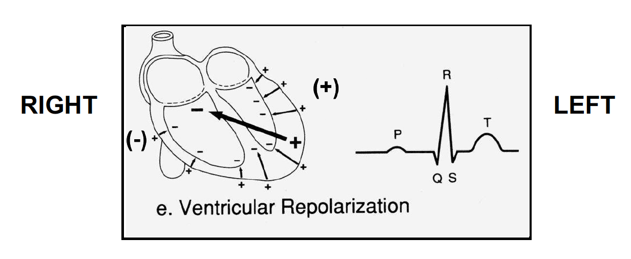**the first cells to repolarize are on the outer surface of the myocardium –> cells go back to negative and the outside is positive –> closer to the positive electrode –> trace goes up even though its repolarization –> eventually whole thing repolarizes and the dipole is lost