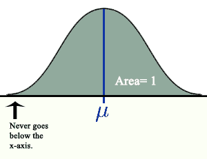 On/above horizontal (x) axis; the area underneath is exactly 1