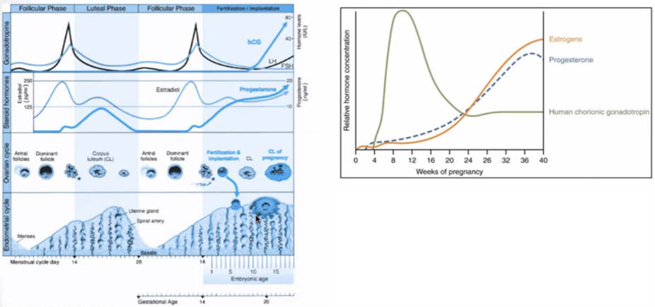o hCG (humant choriogonadrotopin). Stimulerar CL producera steriodhormoner (östrogen/progesteron), högt hCG ev illamående i tidig graviditet