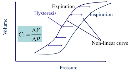 The relationship between volume and pressure, a measure of how stiff a lung is (stiff lungs have low compliance)