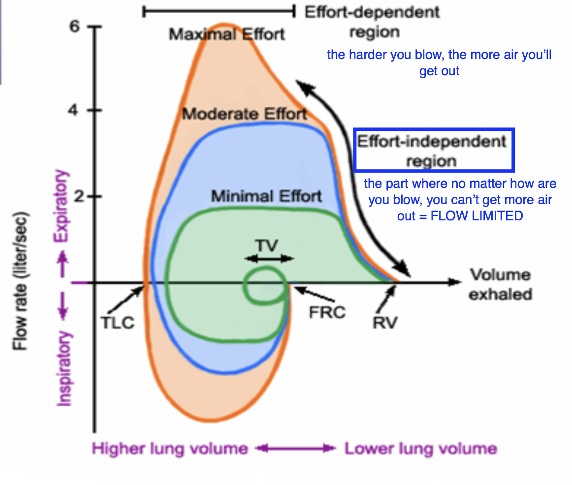 FALSE: Not in the effort-independant phase of expiration. Surprisingly, once flow reaches a certain level, no matter how hard the expiratory muscles push, flow will not increase any further. This phenomenon is called flow limitation.