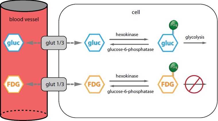 Fluorine-18 (F-18) is a positron emitter, half-life 110 minutes. F-18-fluorodeoxyglucose (F-18 FDG) is a glucse analog that competes with glucose for transport into cells by the GLUT 1 and 3 transporters. After becoming phosphorylated by hexokinase, FDG-phosphate cannot undergo glycolysis and is effectively trapped in cells.