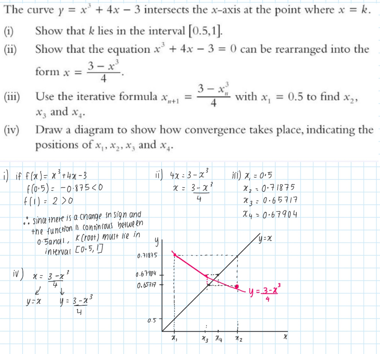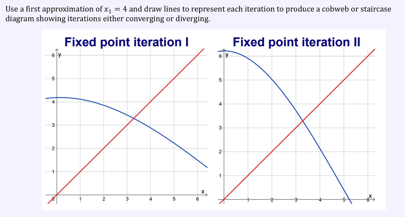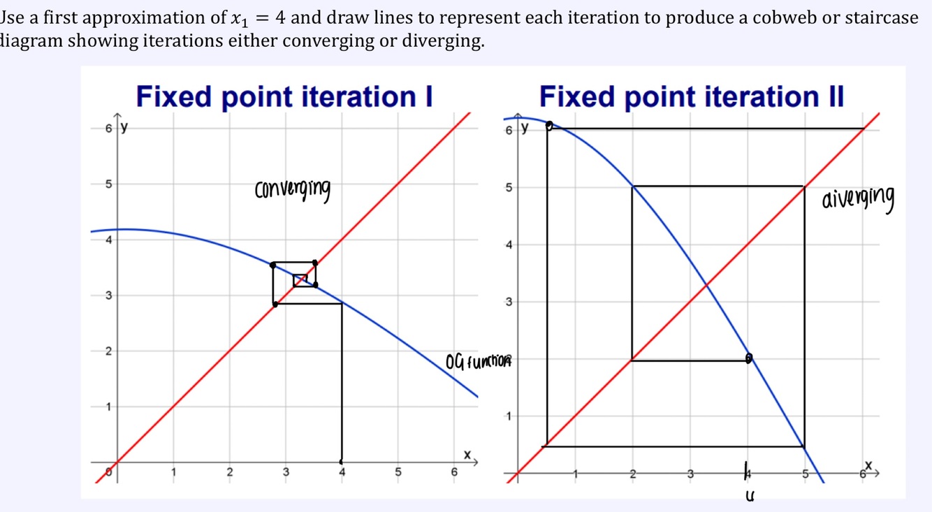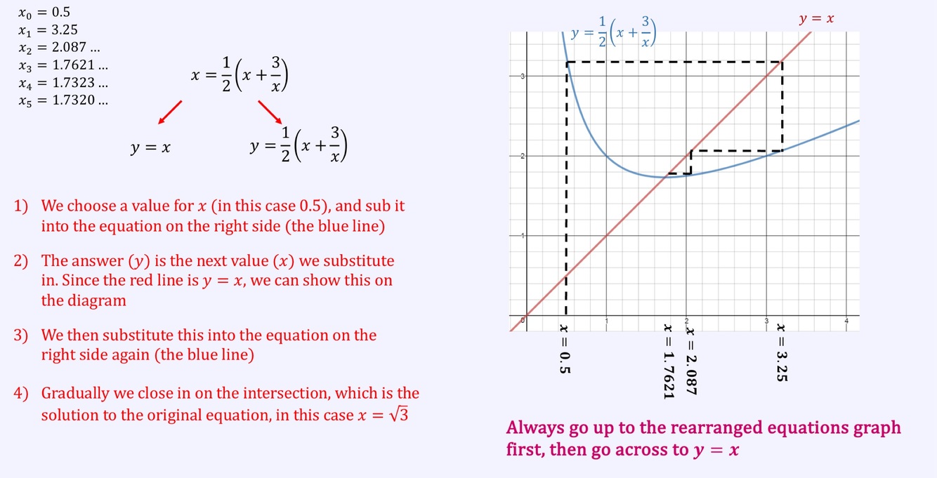 With given starting x value go to rearranged equation line. Then from this y value seek the corresponding x value and see where this x value lies on rearranged equation. Then repeat
