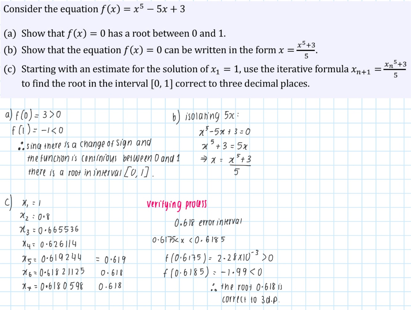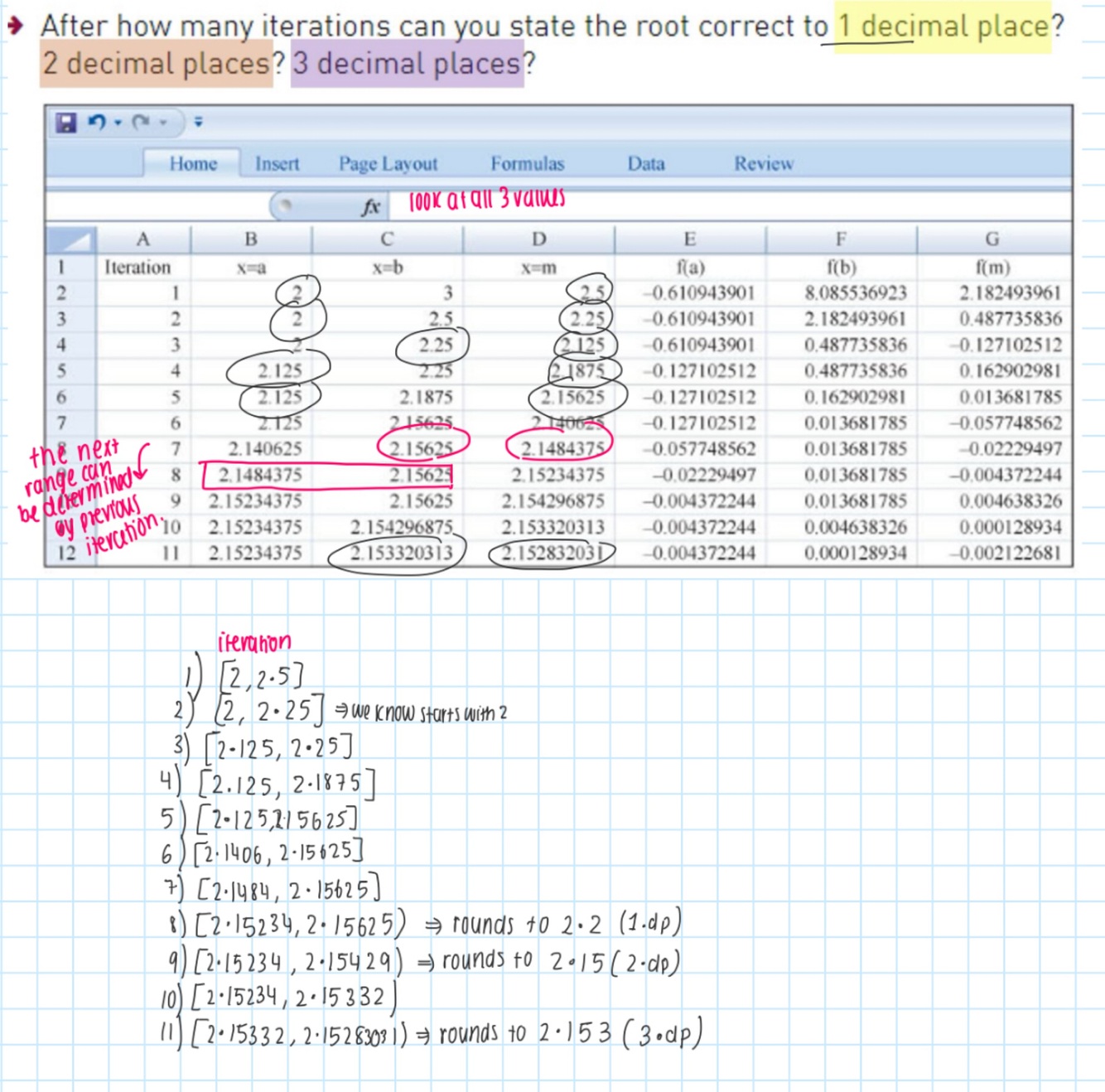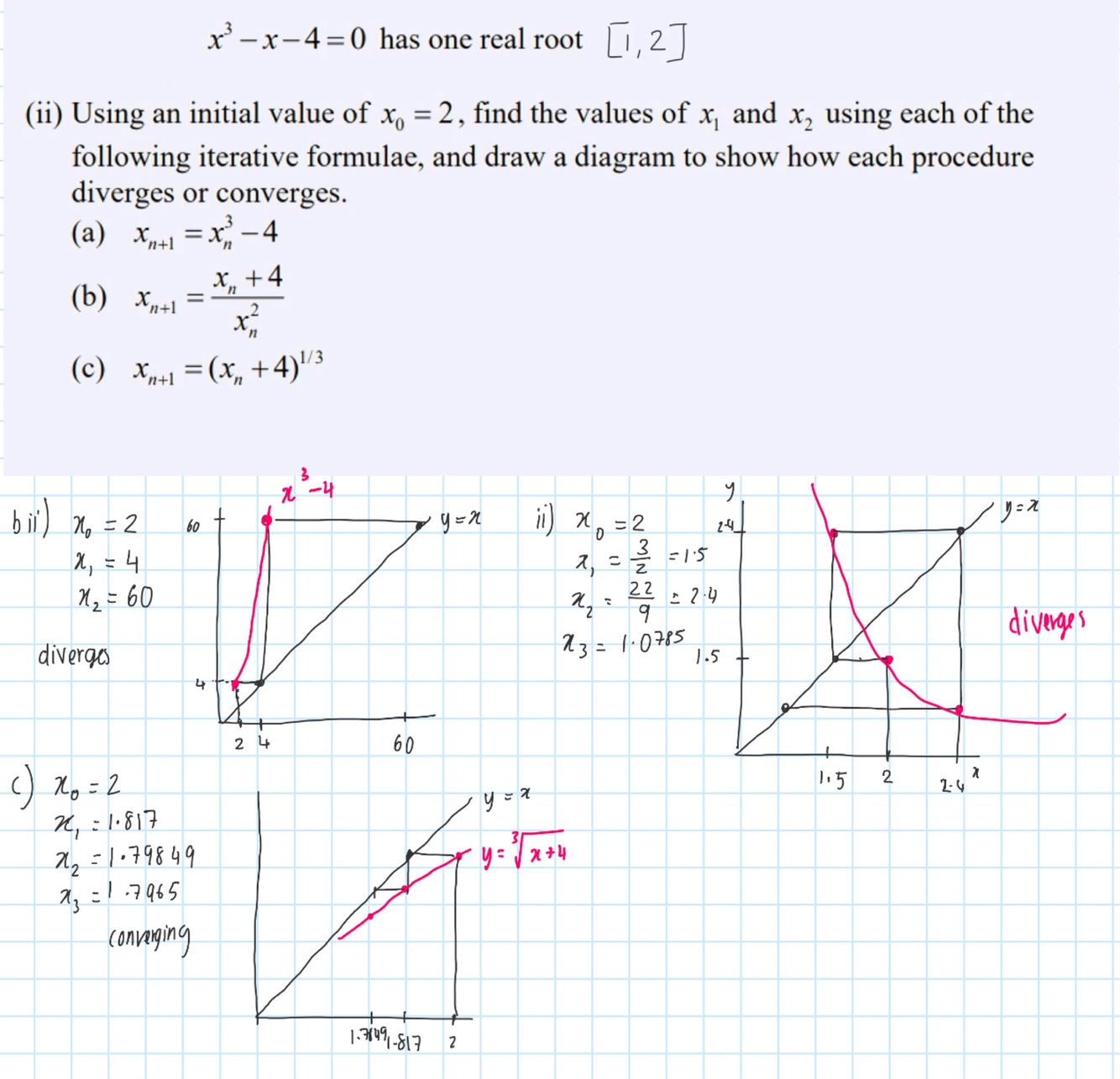 With given starting x value go to rearranged equation line. Then from this y value seek the corresponding x value and see where this x value lies on rearranged equation. Then repeat