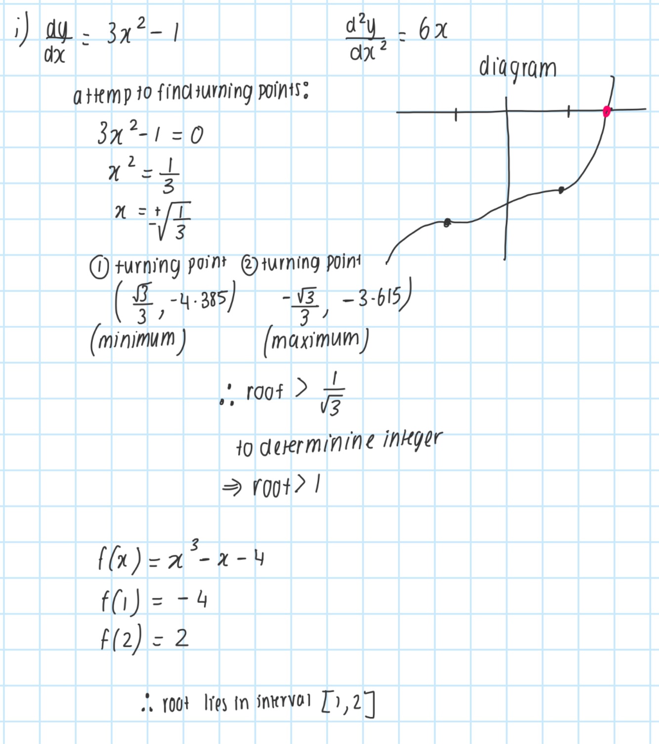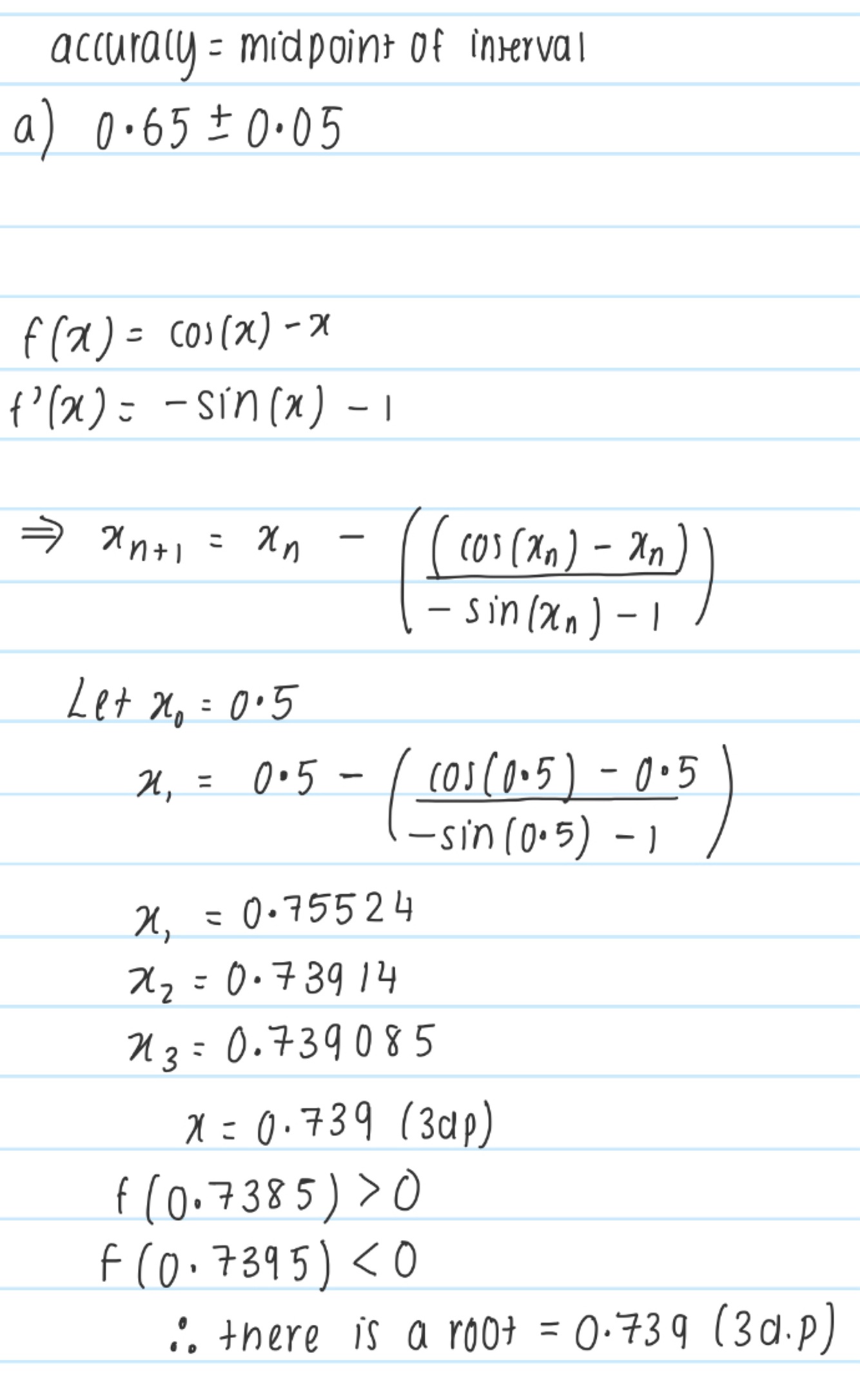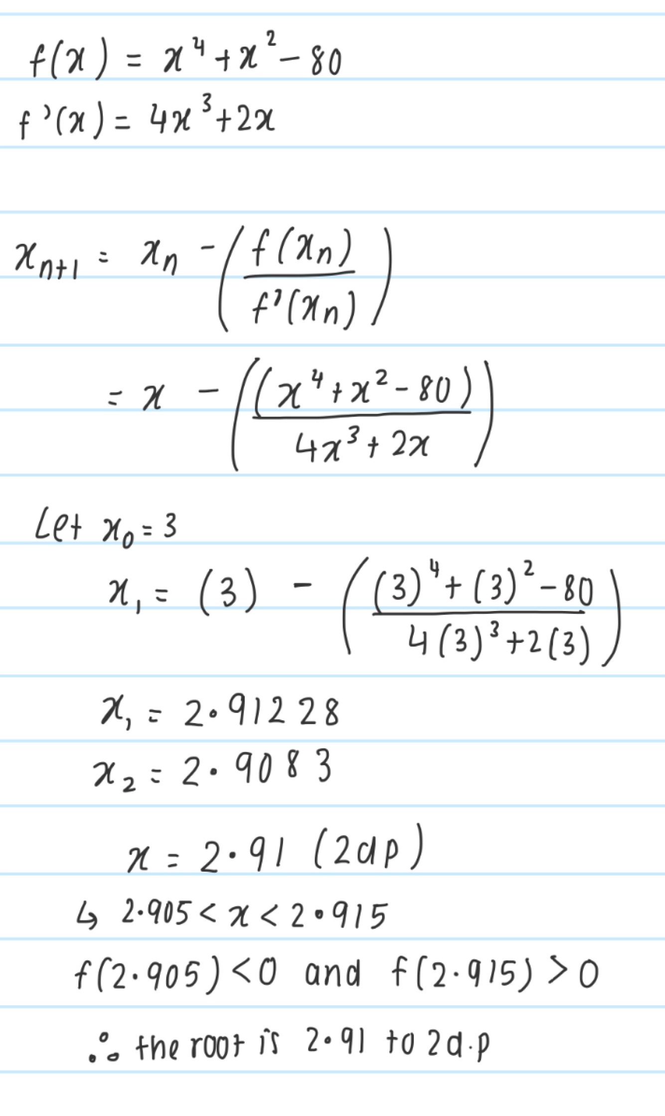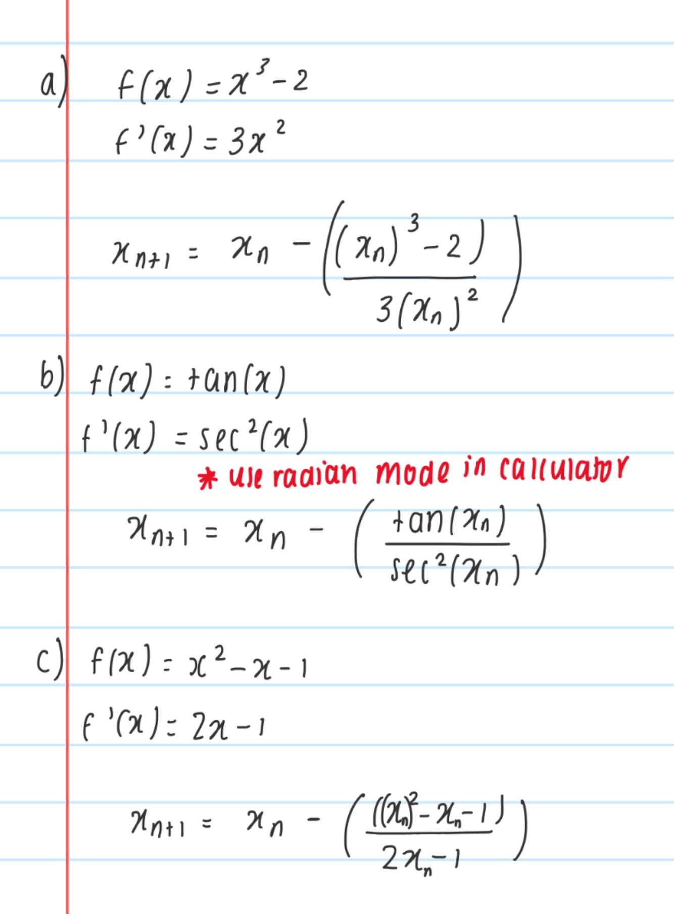 Finding the tangent at specific x value and then finding the x intercept to repeat, eventually coming closer to the root