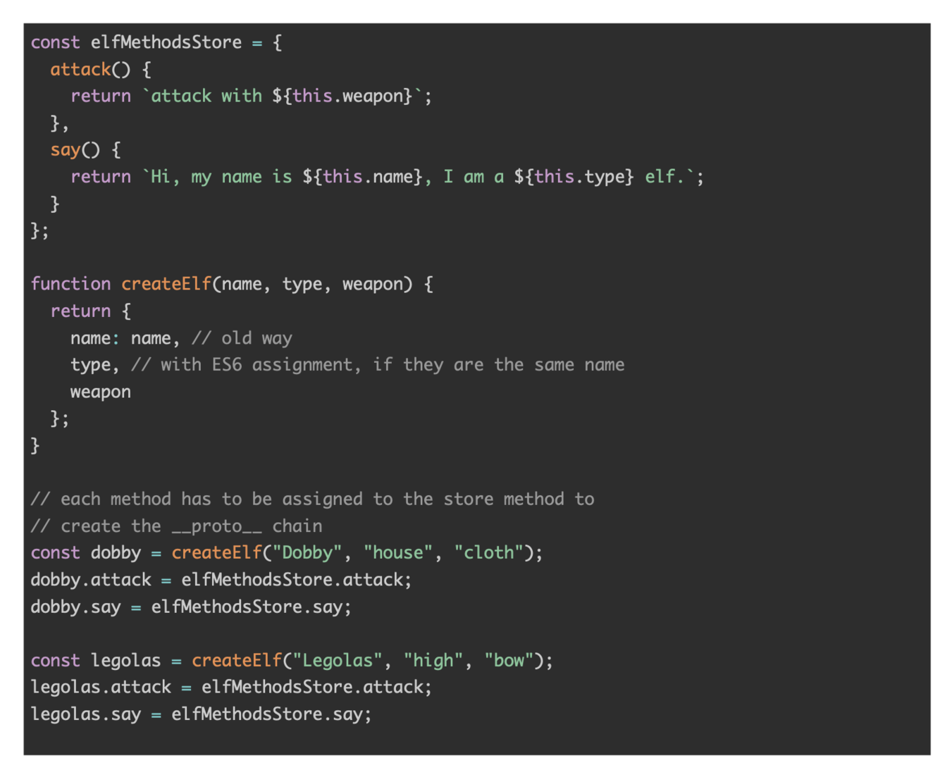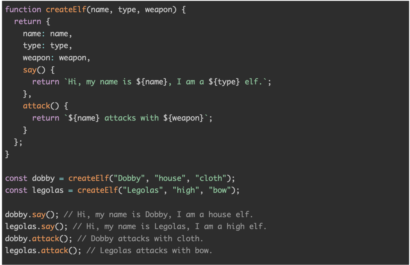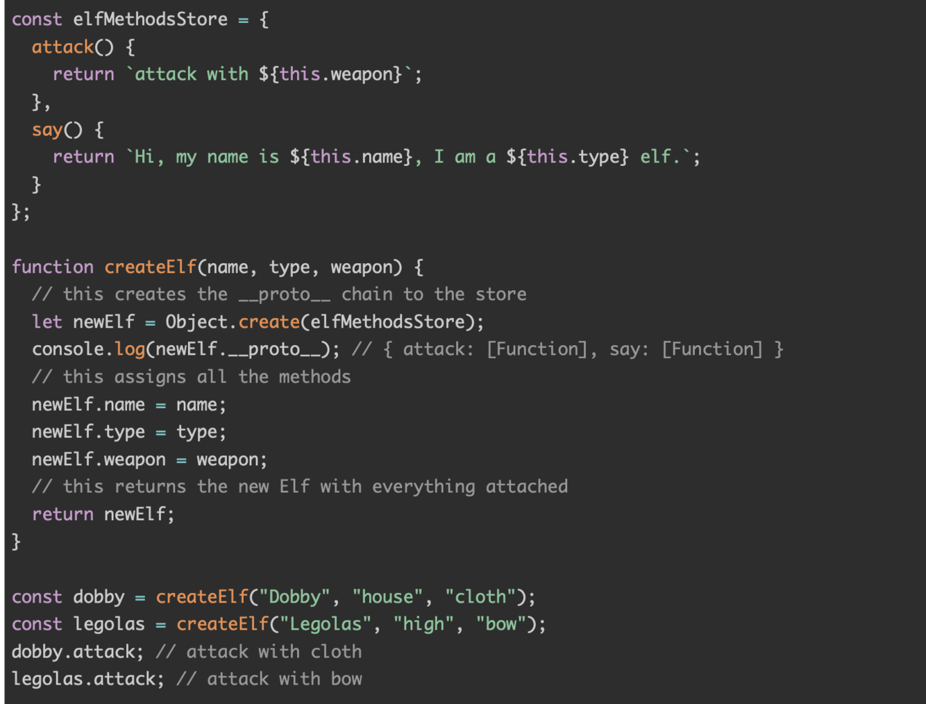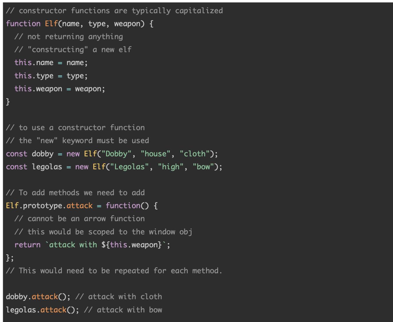 const dobby = new Elf(“Dobby”, “house”, “cloth”);