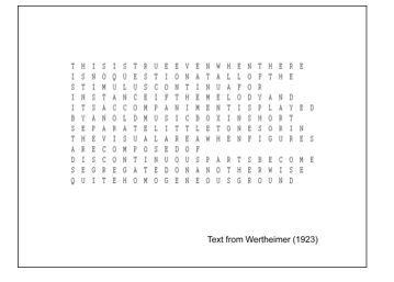 Erasing the bottom half of the abstract object reveals the recognizable object. Why are we unable to recognize the square-root 16? the context of other contours causes us to group the countour elements in a way that prevents the square-root of 16 from making contact with our stored memorey for that object. The implications is that proper grouping is essential for project recognition.