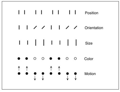 Gestalt grouping principles: “proximity” (position) and various possible dimensions of similairity.