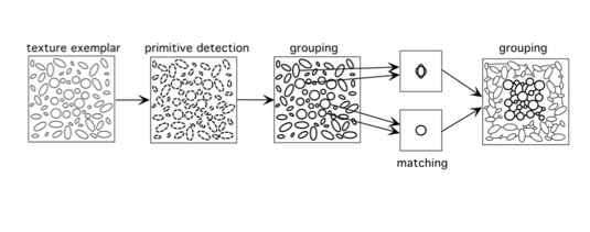 Left to right: input image –> perform feature/primitive detection like V1 –> use cood-continuation, proximity, etc. to form small groups –> use shape similarity (comparing or matching shapes) to form larger groups from small groups.