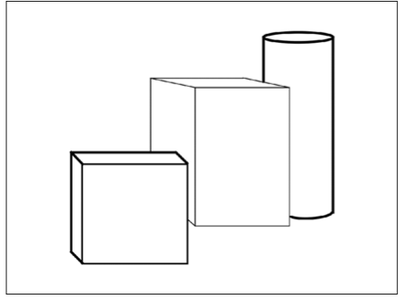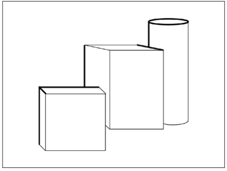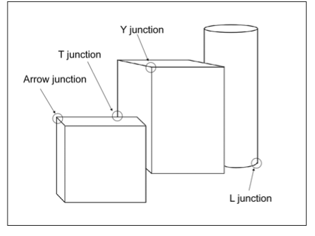 Perceptual grouping also makes use of principles that are based upon the three-dimensional properties of the environment. For example, these line segments are grouped into two boxes and a cylinder. Object corners occluding a background object tend to form an “L junction” or an “Arrow Junction.” Object corners that do not occlude a background object tend to form a “Y junction.” Occluded contours of an object tend to form “T junctions” with the contours of the occluding object. These principles, plus the Gestalt principles, are used to group features into wholes that are likely to correspond to physically sepearate objects.