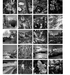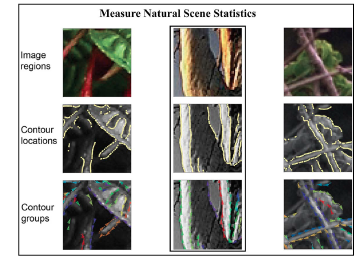 To measure statistics of natural contours, we analyzed 20 representative natural images (close-ups, distant shots, forests, mountains, ocean, sky, water, fields, animals). each image was analyzed separately and the statistics combined.