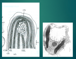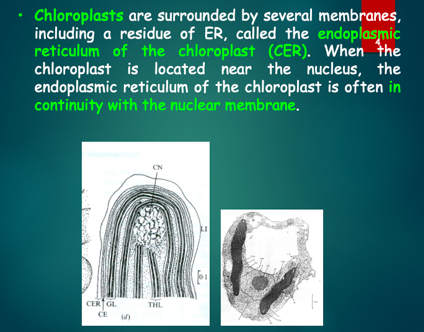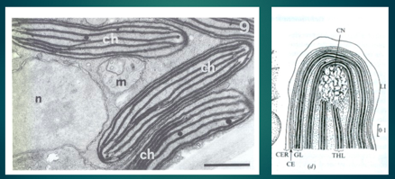 left: 4 chloroplasts, nucleus located near chloropl., unten: continuity with outer membrane of chloropl. and nucle., also thylakoid membrane to form 3 lamella (right picture)