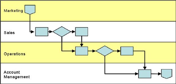 Graphical process elements are organized according to the department responsible for the specific part of the process - It reads from left to right