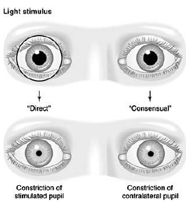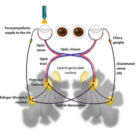 3 synapses: 1) pretectal nucleus, 2) edinger westphal nucleus, 3) ciliary ganglion
