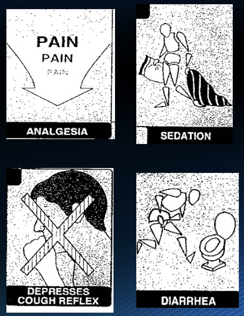Initially causes nausea and vomiting, but it releases histamine so it can cause bronchospasm, blepharitis and hypotension