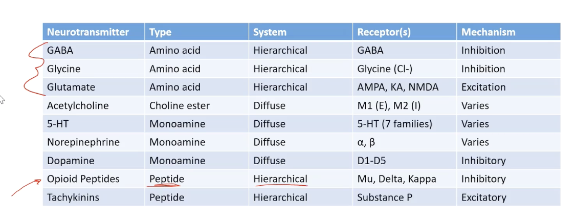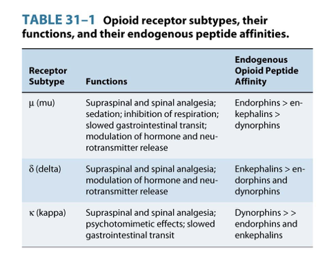 Mu, Delta, Kappa receptors= inhibitory (prevent pain signaling in somatosensory cortex)