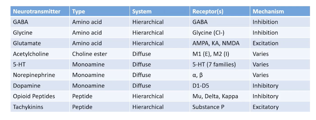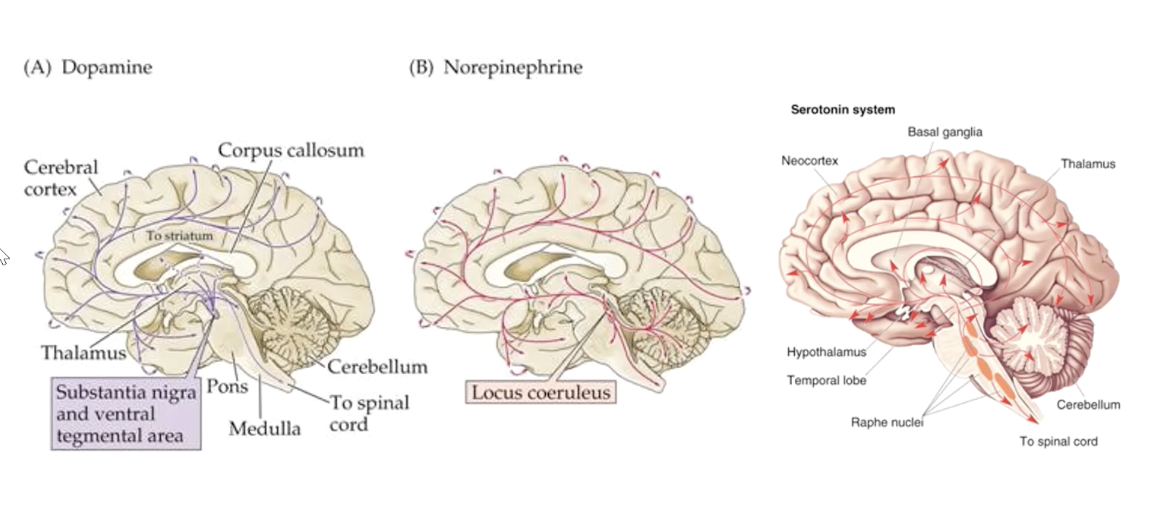 NE, Dopaine, 5-HT released by neuclei= diffuse activation (slower)