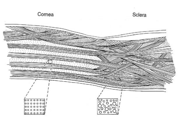 Due to the collagen being laid down in order; collagen fibrils of same diameter laid down in parallel, at equal distances