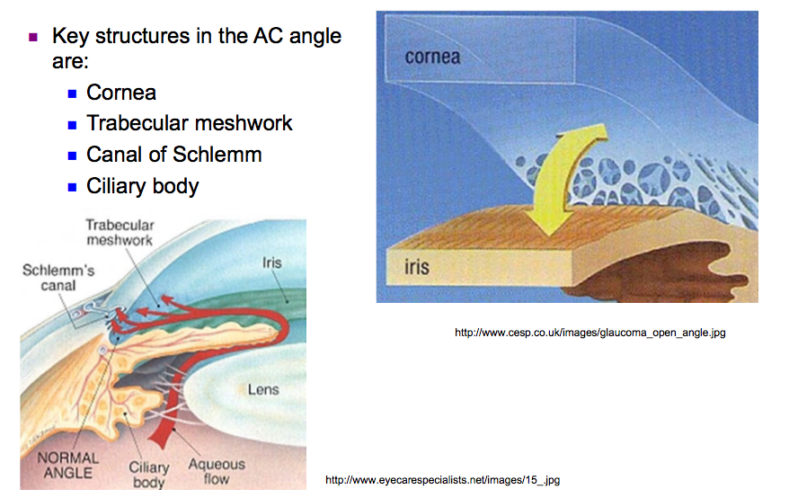 What are the key structures in the anterior chamber angle?