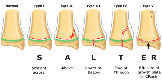 Salter-Harris classification of fractures involving the epiphysiseal (or growth) plate