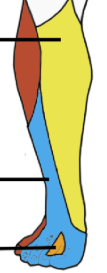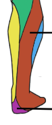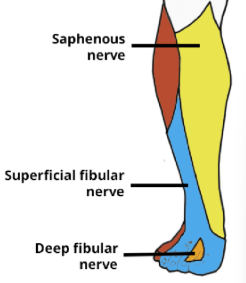 When assessing nerves function in a limbi injury , peripheral nerves (not dermatomes) should be checked. What peripheral nerve area is shaded in brown and which one is purple?