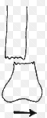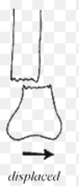 What is the term used to descrie the movement of the distal fracture to the right in the picture below?