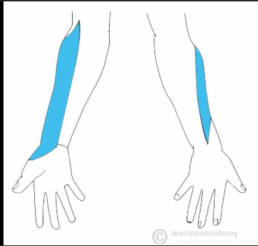 When assessing nerves function in a limb injury , peripheral nerves (not dermatomes) should be checked. What peripheral nerve area is shaded in yellow?