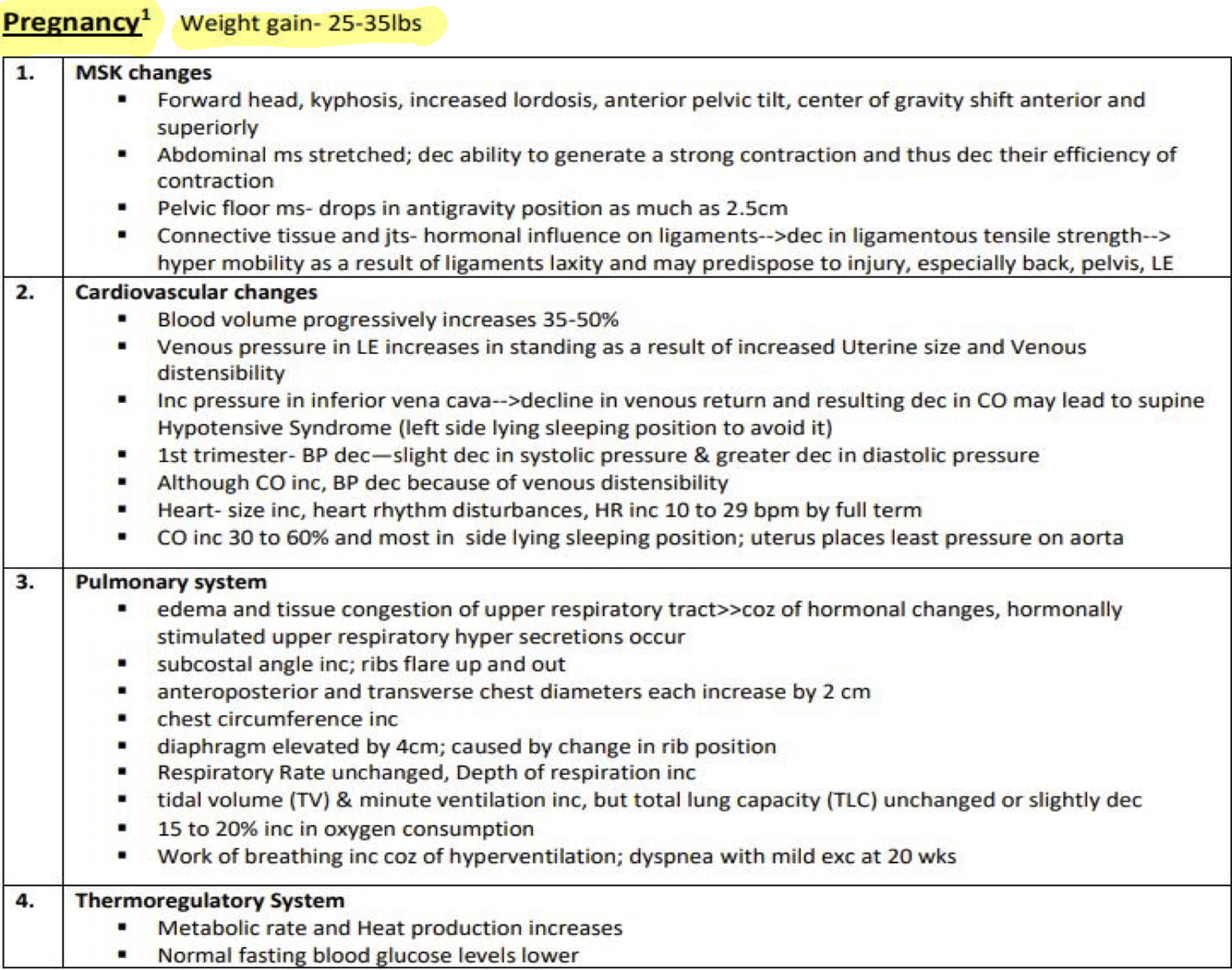 PT educating one of their pts regarding effects of pregnancy and implications for positioning and posture. Which is LEAST approp?