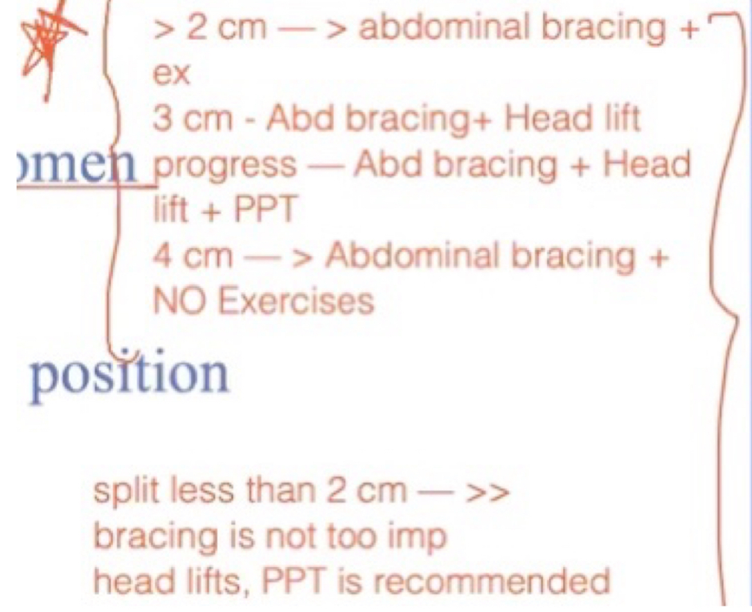 - 3cm–> Abd bracing + Head lift (just lift head); Progression= Abd bracing + Head lift + PPT