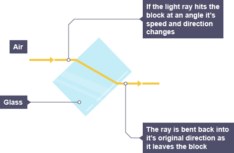 As light waves enter a denser substance they slow down and the wave changes direction towards the normal.