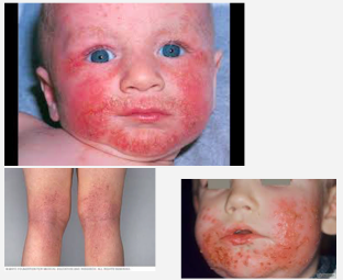 -Starts on face in infancy and then spreads to extremities w/ age